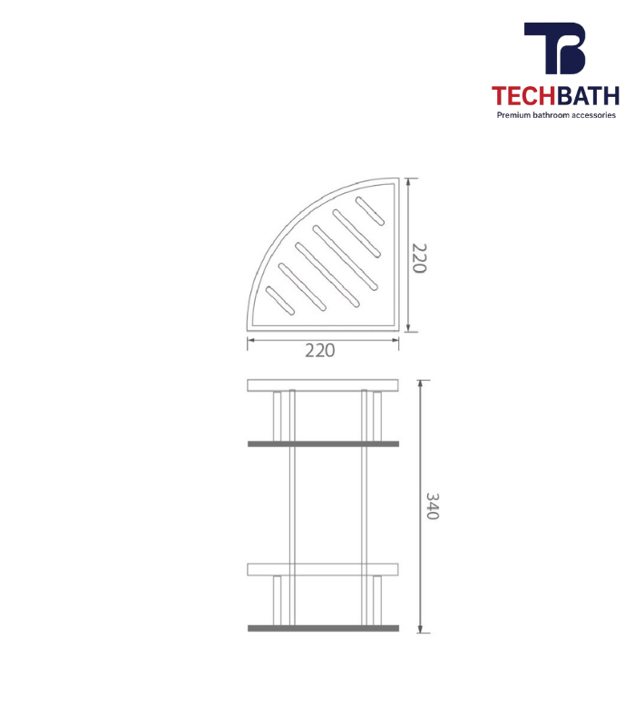 Kệ để đồ phòng tắm TECHBATH T1314.02 được chế tác từ chất liệu inox 304 với kích thước 220x220x340mm, phù hợp để gia chủ lắp đặt tại nhiều không gian khác nhau.