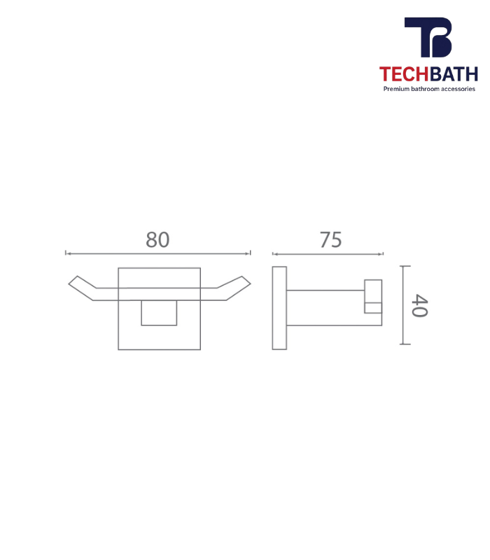 Móc inox treo tường TECHBATH T1403.03 có kích thước 80x75x40mm với đế inox hình vuông được cố định chắc chắn vào tường phòng tắm.