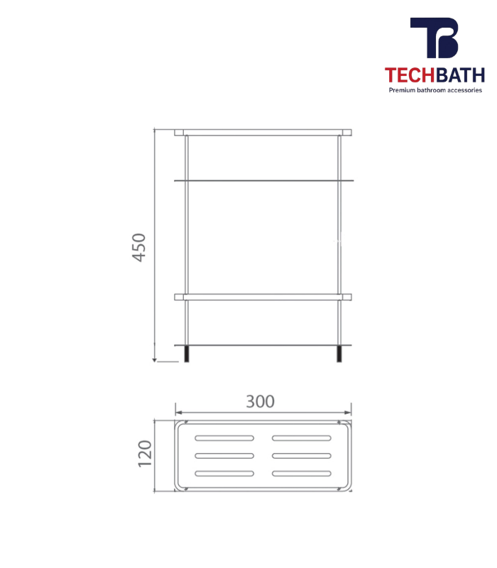Kệ inox phòng tắm TECHBATH T1514.15 đựng nhà tắm hình chữ nhật có kích thước 300x120x450mm. Kích thước sản phẩm lớn giúp người dùng có thể đựng được nhiều vật dụng trong nhà tắm.