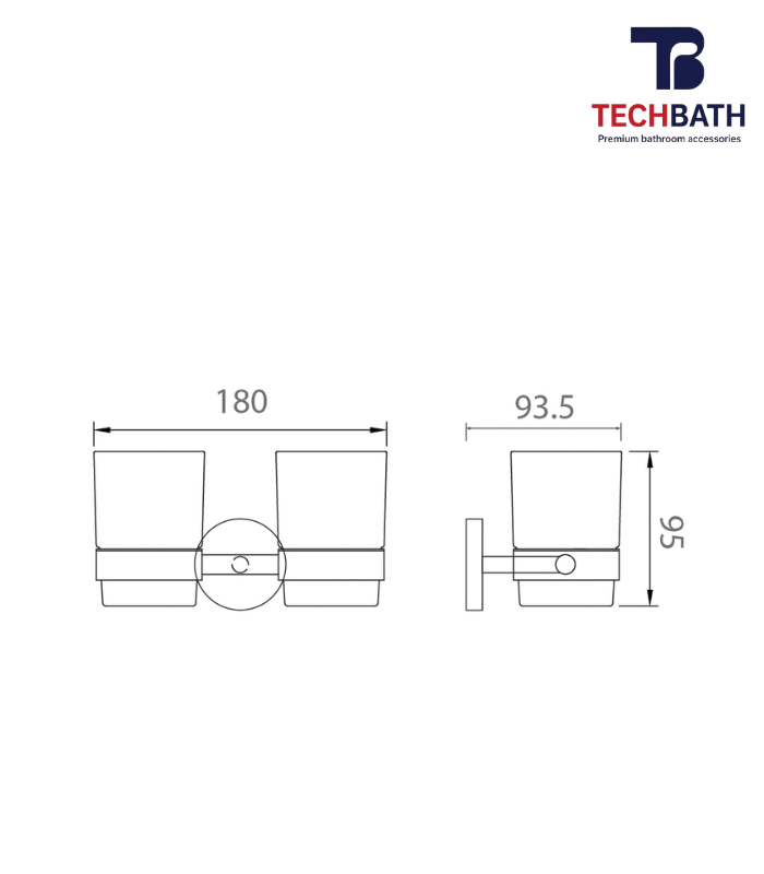 Giá cốc đôi TECHBATH T1210.04 với kích thước nhỏ gọn 180×93.5x95mm, phụ kiện cơ bản được cấu tạo gồm 3 bộ phận chính: đế và giá inox, cốc thủy tinh.